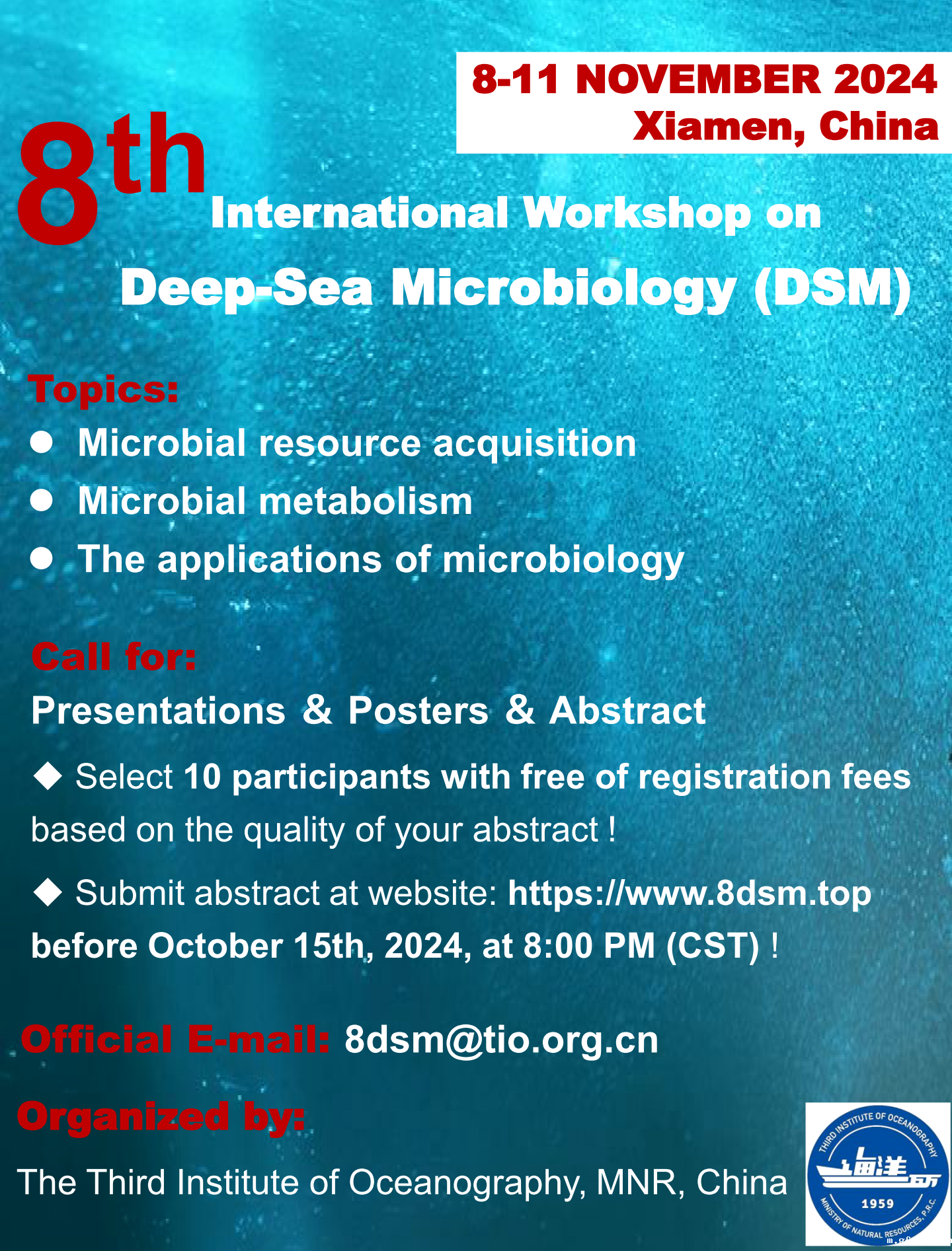 We are excited to announce the 8th International Workshop on Deep-Sea Microbiology (DSM), which will take place in the beautiful city of Xiamen, China, from November 8th to 11th, 2024.