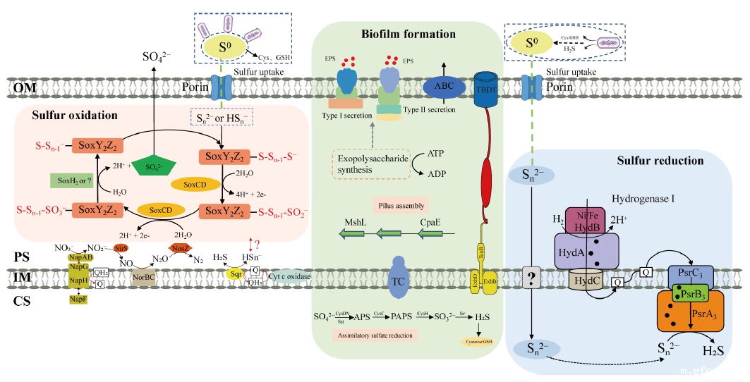 OM,外膜;PS,周质空间;IM,内膜;CS胞质空间;Sox,硫氧化多酶复合体;Q,分子醌;Psr,多硫化物还原酶;TC,双组分系统;TBDT,TonB依赖型转运蛋白;关于能量保存假设反应用问号表示。